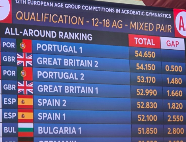 They were 7th after the first day of qualifications, but moved up on the second day, when they performed their balance routine. They achieved a remarkable 3rd place in Europe on the day, which earned them the 4th place overall (GBR1).