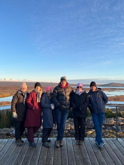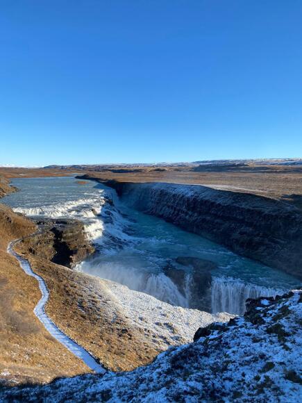 On day four we awoke to an amazing sunrise and our first stop was Reyinsfjara black sand beach. This was a thrilling stop as we had to be careful of the huge freak waves that can rush into shore at any moment, which was exciting for us but very stressful for Miss Smith! Combined with the imposing backdrop of the basalt cliffs and vertical columns, formed by lava flows which had been quickly cooled by the incoming tides, it was overall an amazing sight to see. Our next stop was Gullfoss waterfall, which was at a higher altitude and, as a result, was frosty and parts of the ground were covered in snow and ice. This waterfall was made all the more beautiful by the fact that, as we arrived, a rainbow appeared over it, which was stunning. Then we made our way to the Geysirs, a geothermal phenomenon where a column of water shoots up from the ground. This was such an impressive thing to see and unlike anything I had ever experienced before. After this we took a short coach ride to Þingvellir national park which sits on the Mid-Atlantic ridge and is where the first Icelandic parliament started. This was an extremely interesting stop and our tour guide, Doddy, told us all about the history behind this iconic site of Icelandic history.