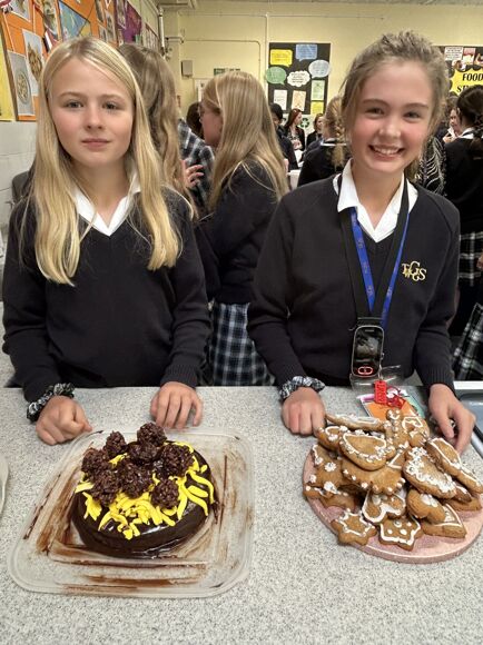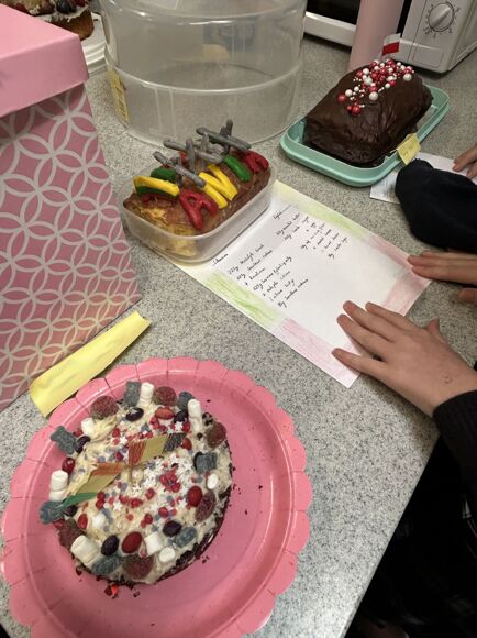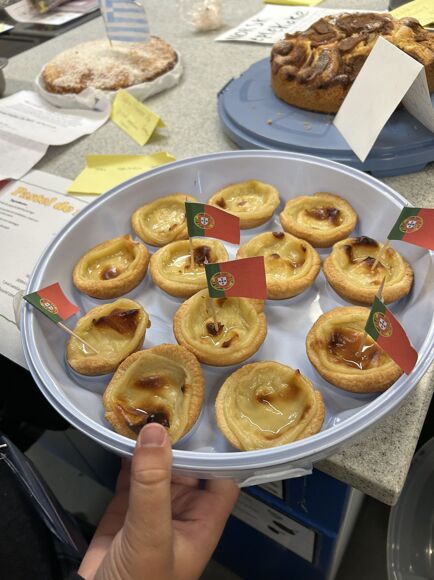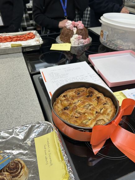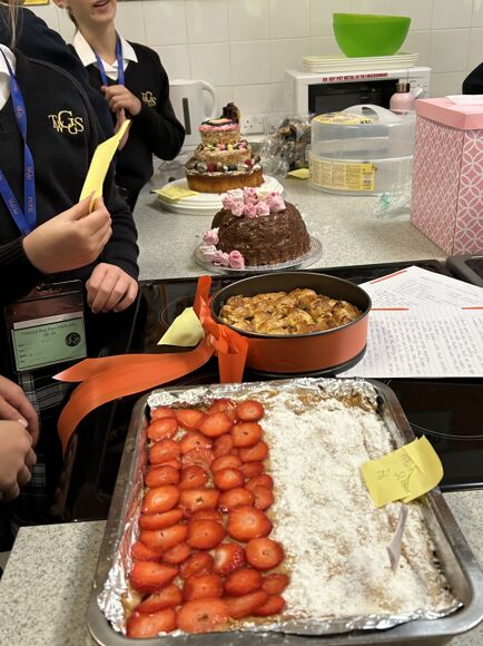 Use of Language: Caroline M with her cake decorated with the German for 'Grammar School for Girls' and Millie H's Portuguese Pastel de Nata with a detailed recipe in Portuguese.